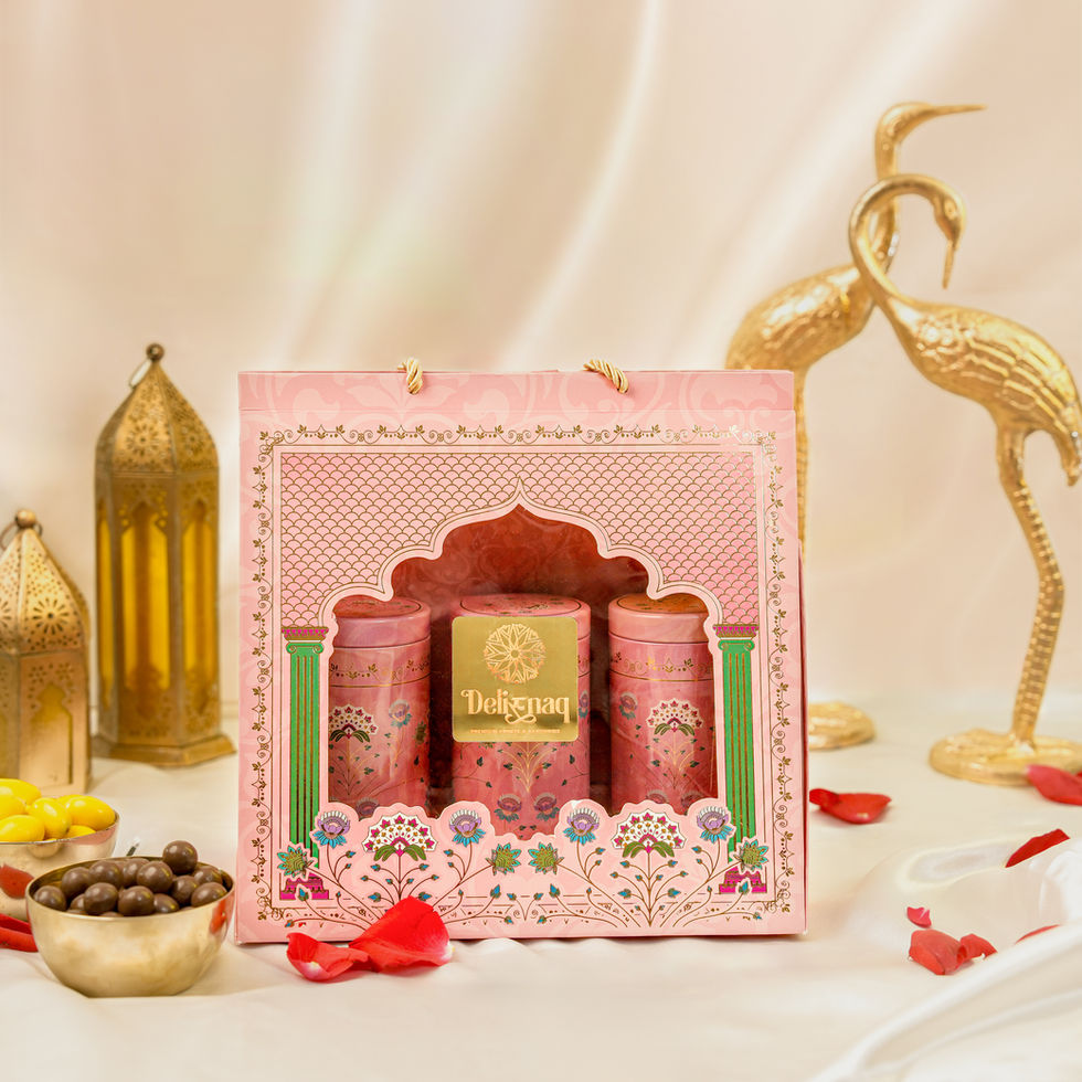 An elegant gift featuring three ornate pink and gold tins, each filled with 350 gms of premium assorted dry fruits. A beautiful, wholesome, and perfect gift for any celebration.