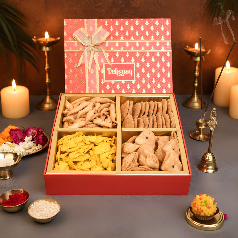 Enjoy the authentic taste and variety of traditional Indian namkeen with Delisnaq's Festive Red Box.