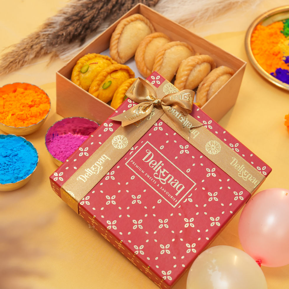 The Royal Ras-Rang Box is a luxurious celebration of Holi's most beloved treat. Featuring a pair of Delisnaq’s signature Classic Mewa and Aromatic Kesar Gujiyas, this hamper is a masterclass in traditional textures. Handcrafted with pure desi ghee and premium nuts, it’s a sophisticated gift that brings the authentic "Old Delhi" festive spirit to life.